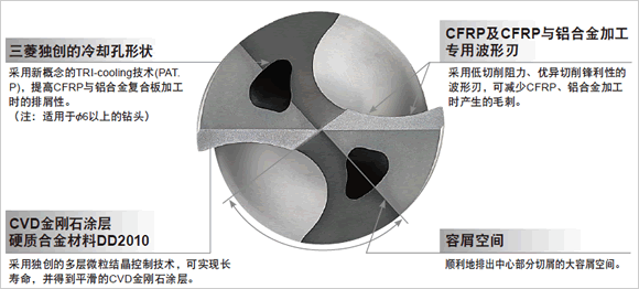 MCS型钻头采用了CFRP、CFRP和铝合金板的复合板孔加工时所需要的特殊化切削刃设计和多层微粒CVD金刚石涂层,实现了优异的孔加工精度和刀具的长寿命。而且还使用了三菱独自开发的冷却孔形状,大幅提高了加工CFRP、CFRP和铝合金板的复合板时的排屑性能,实现了优异的加工精度。
